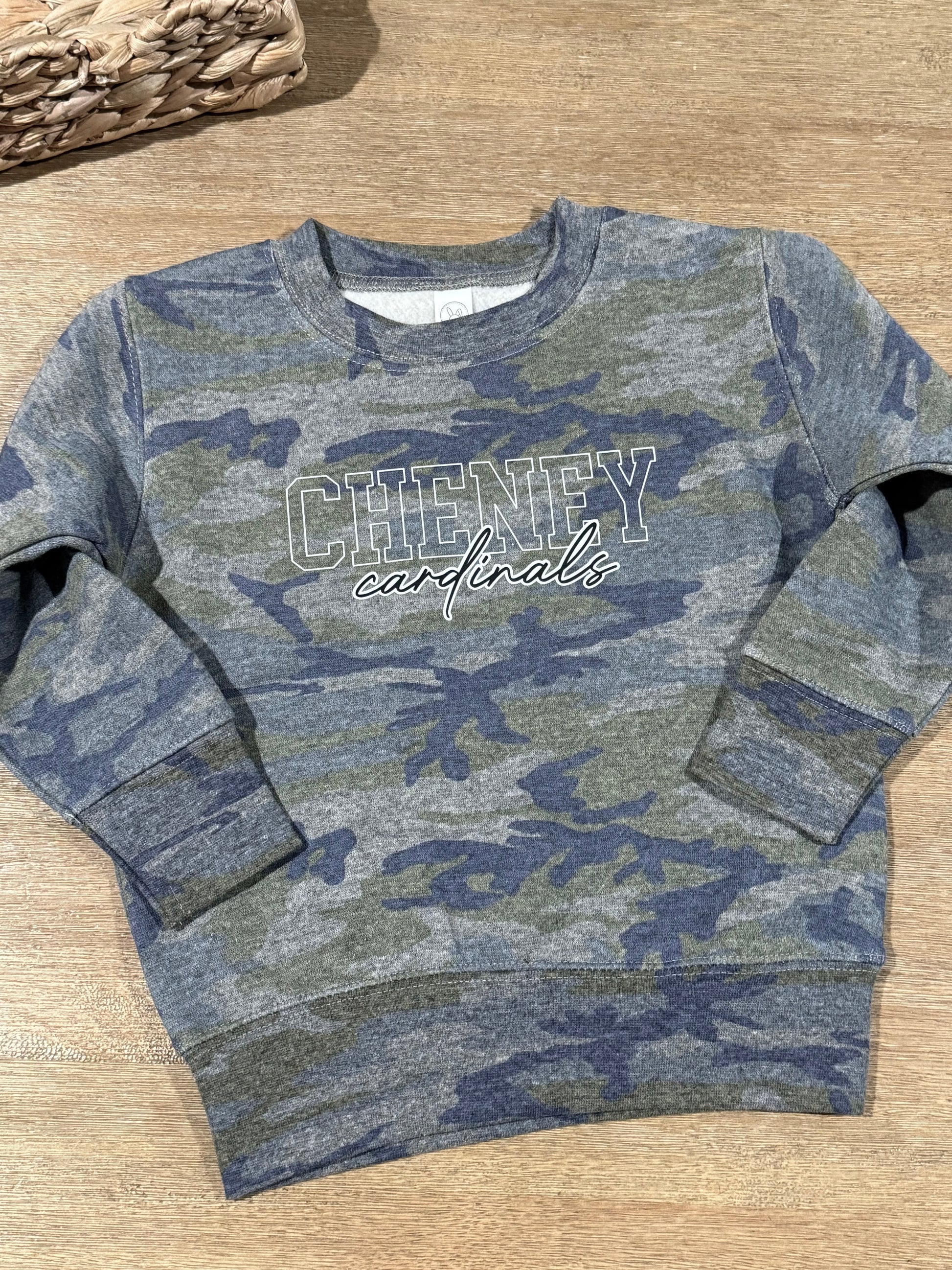 Stand out while you show up for your team! This cozy camo crew is fully customizable with your school or mascot name — perfect for game days, spirit wear, or just repping your community in style.